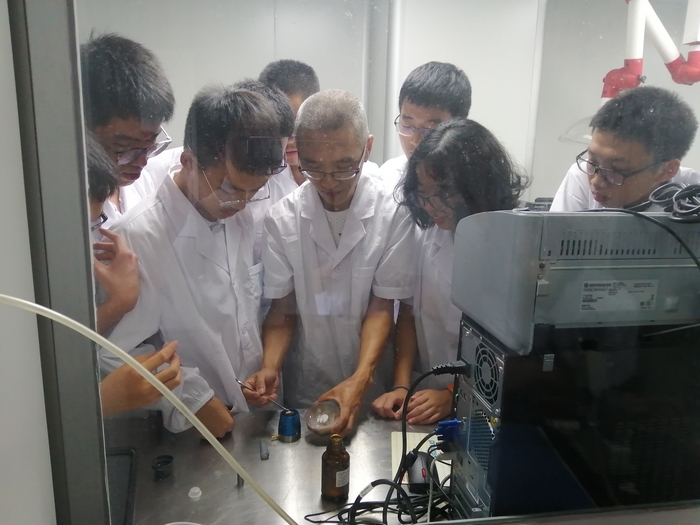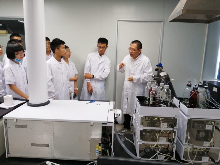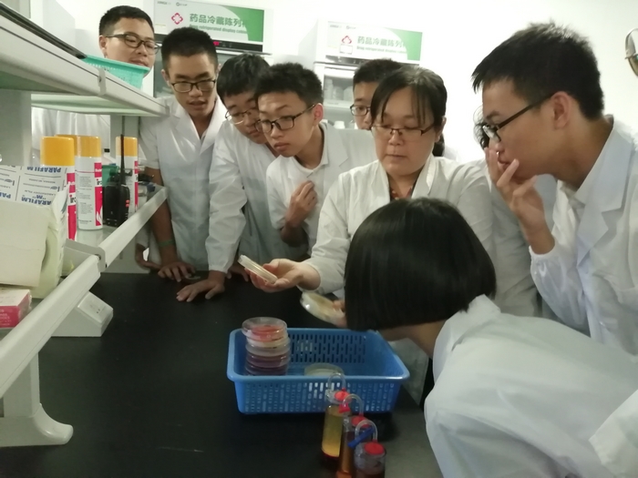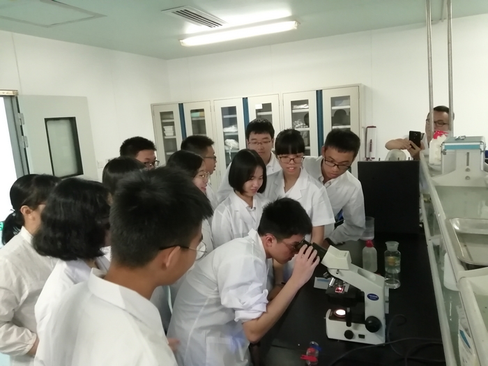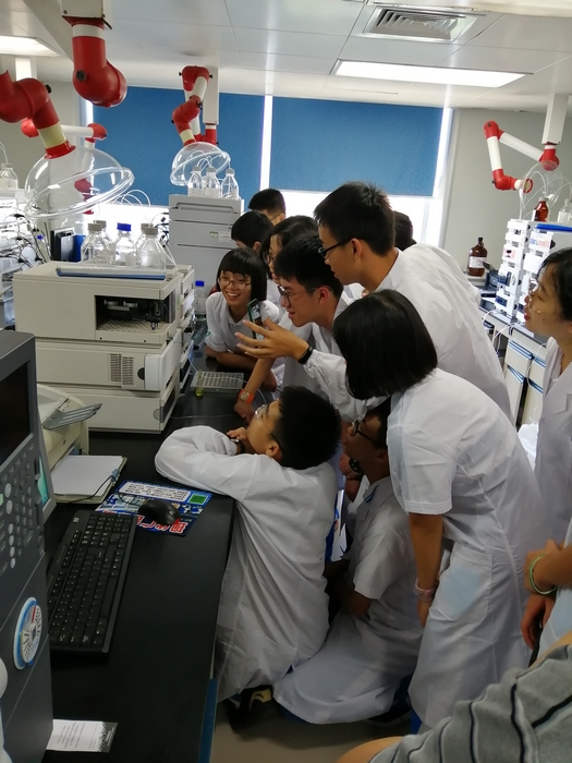 在化学药品检验室,检验专家手把手带领同学们演示了溶出度测定仪、高精度称量天平、高效液相色谱仪、气相色谱仪、红外光谱仪等精密仪器的操作,同学们热情高涨,争先恐后。